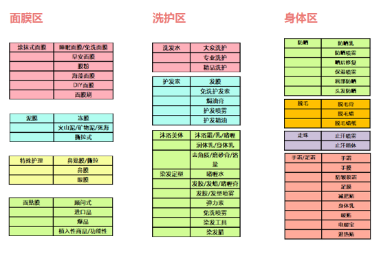 商品模块可以依据产品品类大致划分为十个大类:护肤区、彩妆区、生活用品区、工具区、面膜区、洗护区、身体区、母婴区、男士区、香水区。每个大类之下都有诸多分支,根据功效、价格等进行细分,相同类型的产品又能覆盖多个品牌。