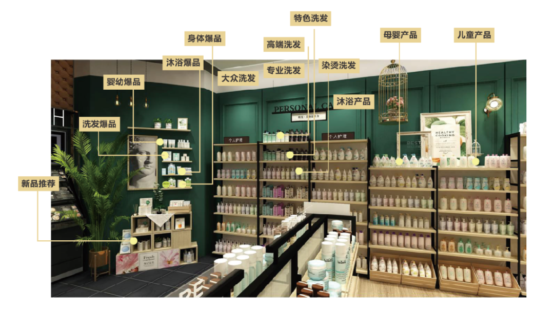 商业街售卖的商品模块属性往往偏向于快销性质,但在社区店和乡镇店就完全不一样,前者重在于中高端美妆商品的售卖,后者重在于一站式的个人护理,以及用户群体对生活用品的购买需求量偏大,因而洗护类的商品相对应的模块如图所示,洗护商品模块要更加完善些。