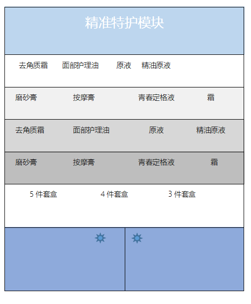 我们且折射至整个门店的商品结构,多数门店都涵盖有两三千,甚至三四千个SKU,依照品牌的人群、价格、功效定位划分,有些条码是相互重合的,这就要先依照“商品模块”进行一一梳理,确保每一个分类都有单一对应的品牌和产品。