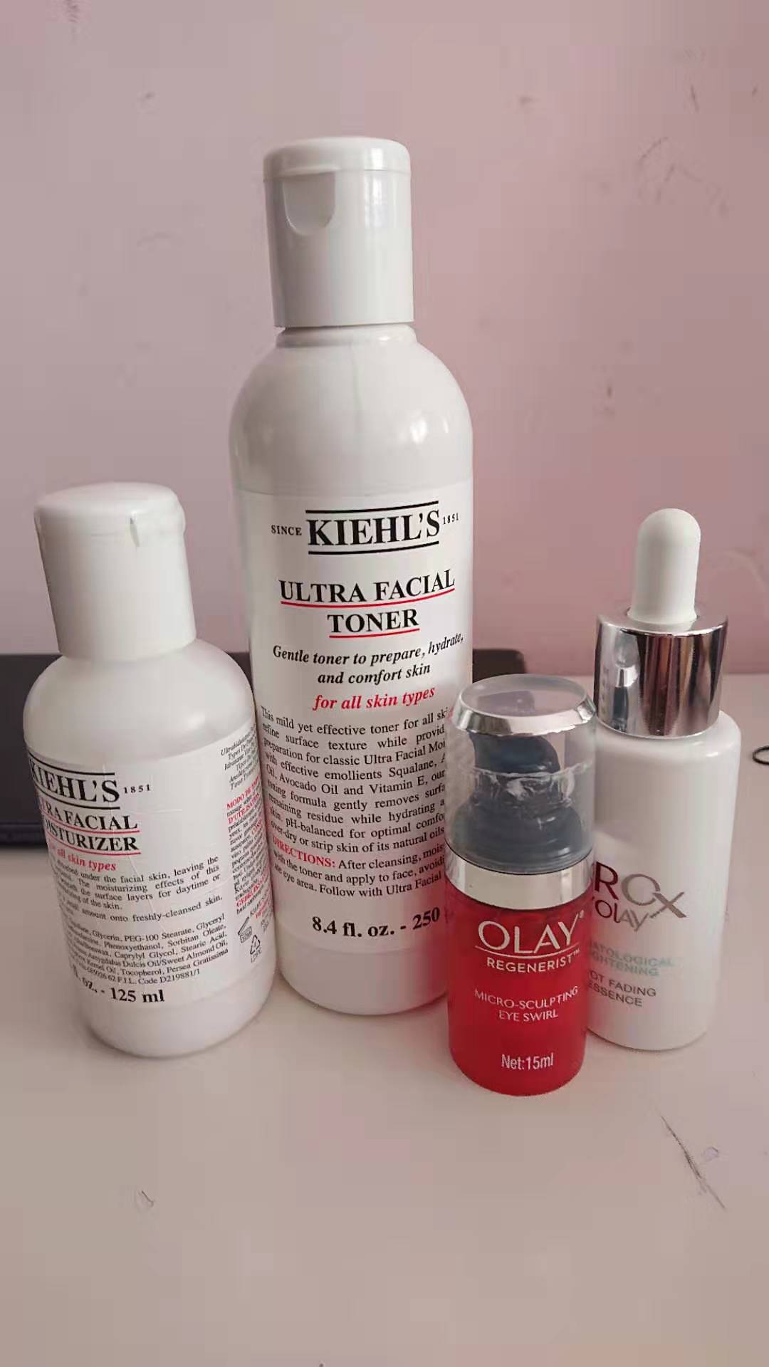 使用感:科颜氏水乳挺补水的,但是不适合敏感饥用,而且味道也难闻,不过用时间长了挺稳定的;Olay小白瓶去痘印效果不错,还可以提亮肤色;Olay眼霜去眼角细纹效果显著。