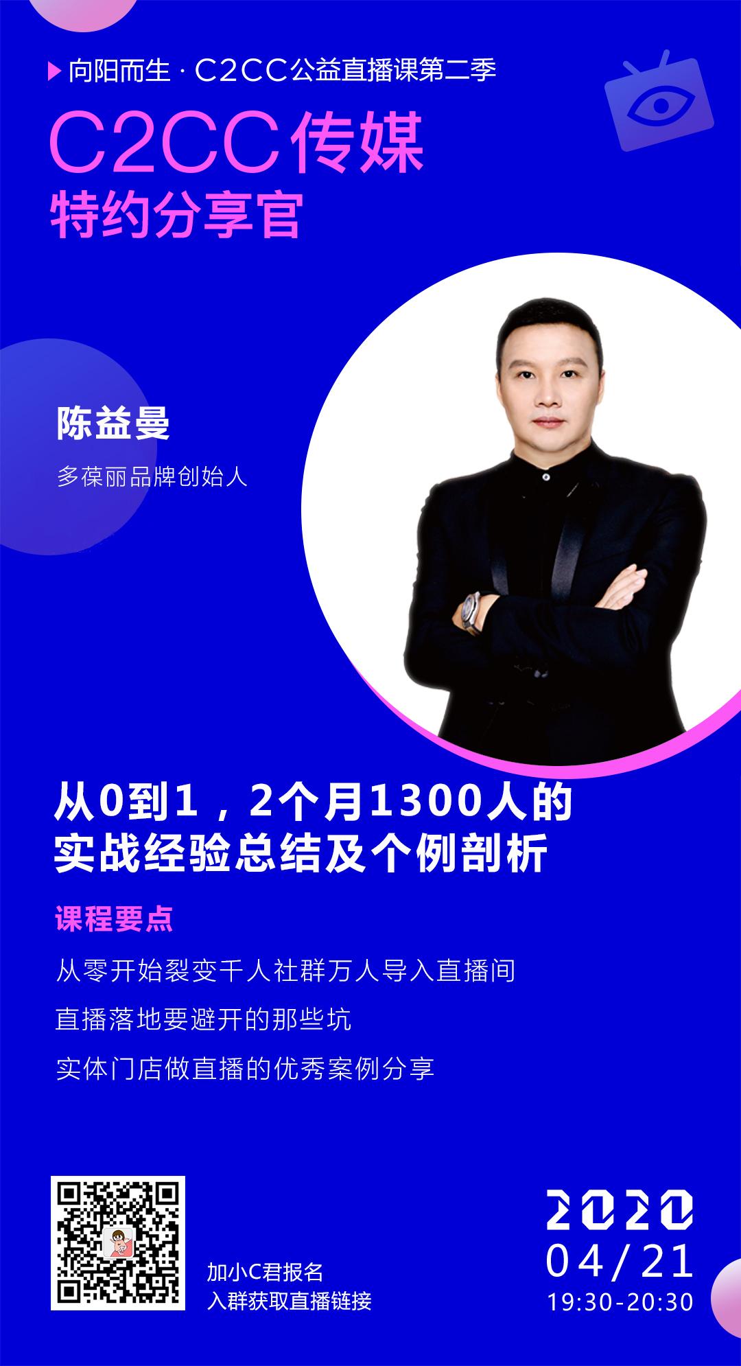 第二位分享嘉宾多葆丽品牌创始人陈益曼将于4月21日晚上19:30-20:30与大家分享。从代理商转型为品牌商的陈益曼,拥有着服务零售门店的经验,同时也深谙代理商运营痛点,疫情期间的2个月内,他通过培训+实战落地,用社群工具实现了终端赋能。