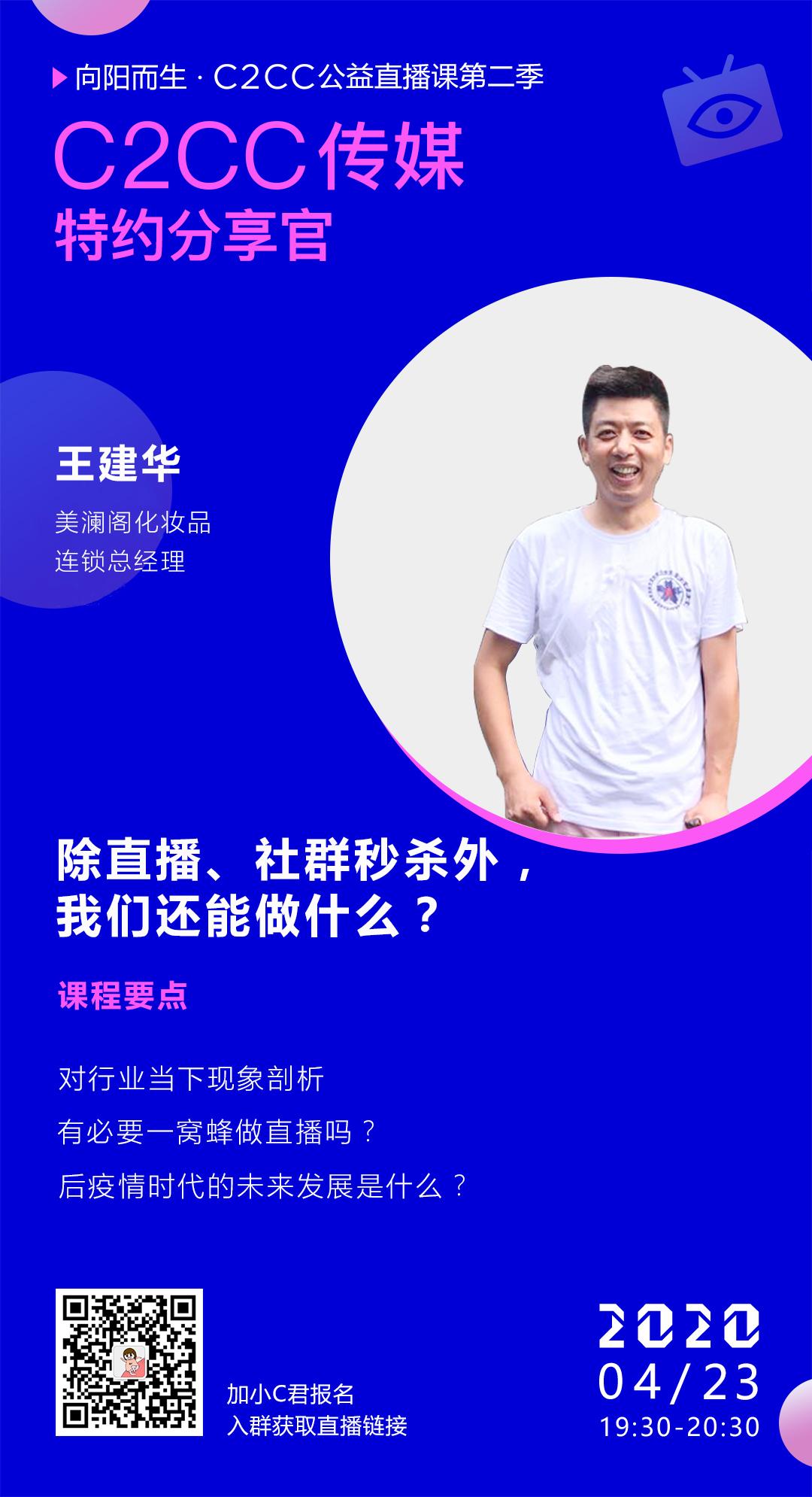 第四位分享嘉宾美澜阁化妆品连锁总经理王建华将于4月23日晚19:30-20:30与大家见面。他是一个从业15年的基层老兵,一个不走寻常路的独行者,对行业有着独到见解。