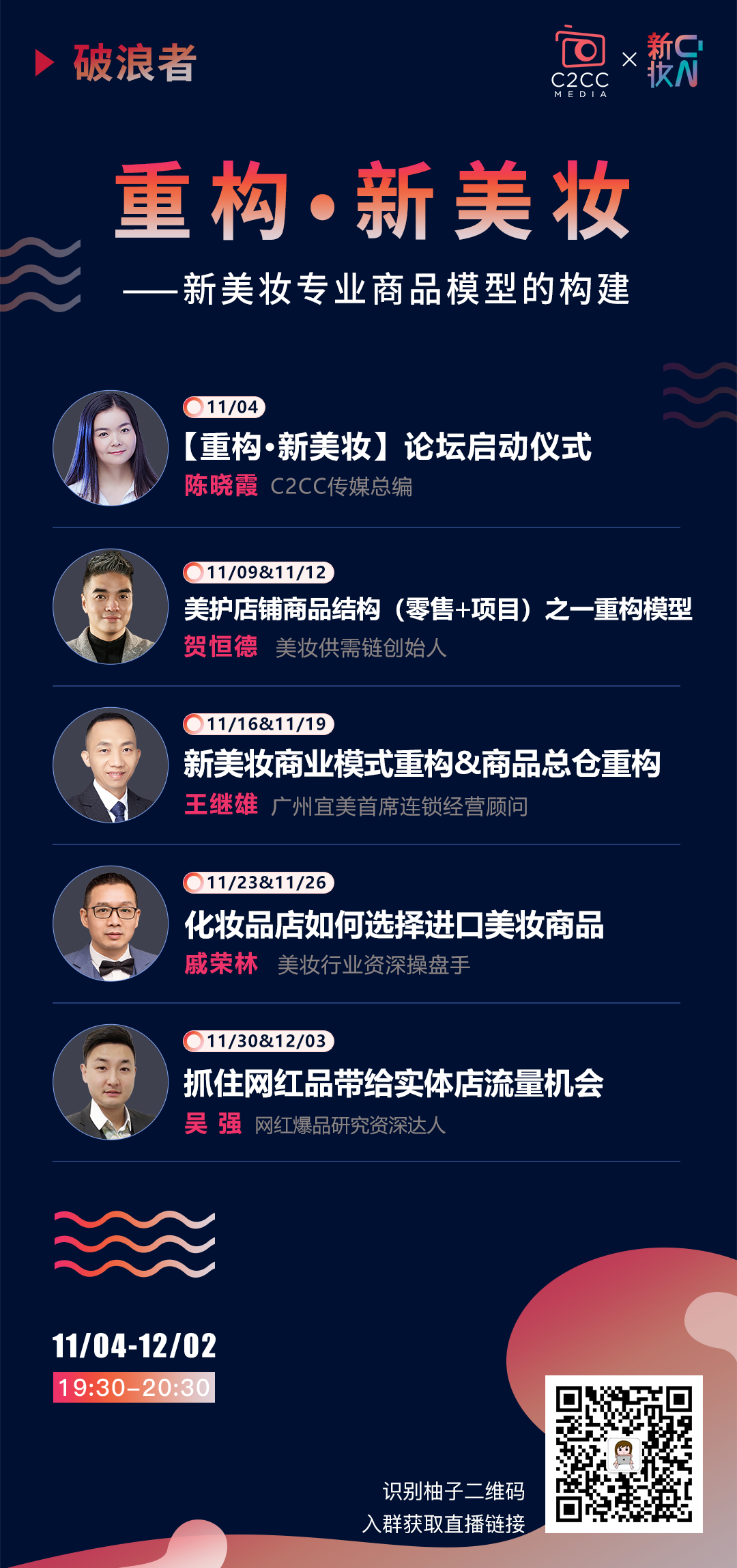 此次《重构·新美妆》超级选品团的“出击”,为进一步推动和赋能行业的变革及发展,C2CC传媒联手新妆特邀深圳链美优源——美妆供需链创始人贺恒德老师、广州宜美首席连锁经营顾问王继雄老师、美妆行业资深操盘手戚荣林老师、网红爆品研究资深达人吴强老师,发起以“重构·新美妆”为主题的超级选品团论坛及围绕“新美妆专业商品模型的构建”开展第六季破浪者直播课。