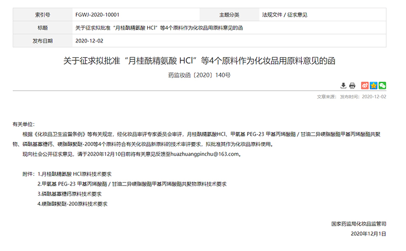从药监局公布的信息来看,月桂酰精氨酸HCl、甲氧基PEG-23甲基丙烯酸酯/甘油二异硬脂酸酯甲基丙烯酸酯共聚物、磷酰基寡糖钙、硬脂醇聚醚-200等4个原料将作为化妆品原料使用。