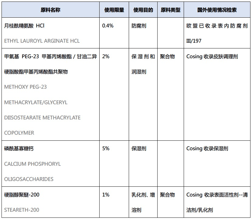 这次所公布的4个新原料中,除了月桂酰精氨酸HCl作为防腐剂为中高风险原料以外,甲氧基PEG-23甲基丙烯酸酯/甘油二异硬脂酸酯甲基丙烯酸酯共聚物、磷酰基寡糖钙、硬脂醇聚醚-200等均保湿剂、乳化剂等低风险原料。