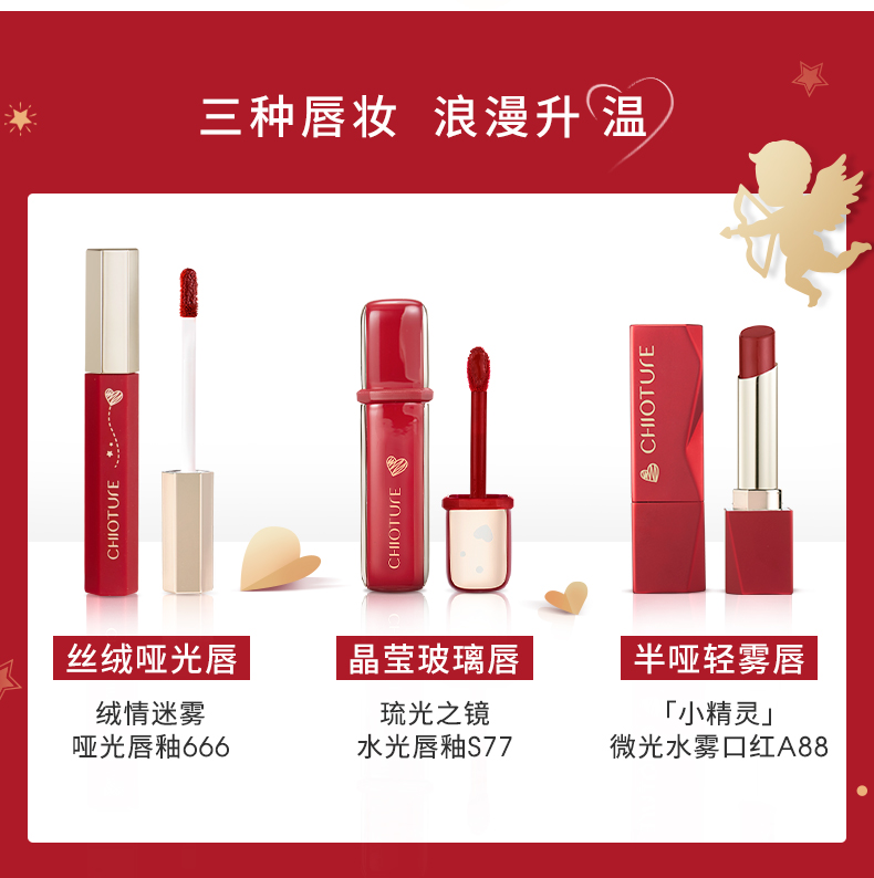 稚优泉在此次圣诞礼盒的包装上设有小心思:拉动丝带,当丘比特之箭射中爱心时,礼盒即可打开。礼盒中包含了稚优泉三款热门色号口红,产品虽不多,胜在平价,利于打开学生市场。