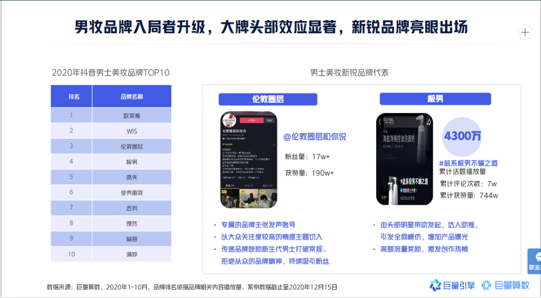 目前市面上已有不少男士彩妆品牌被中国消费者所熟知。据巨量计算显示,2020年抖音男士美妆品牌TOP10中,就有不少品牌涉及了男士彩妆,比如欧莱雅、伦敦圈层、极男、理然、赫恩、满婷等。