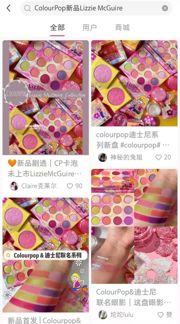据悉,ColourPop的Lizzie McGuire系列新品将于3月26日上午10点(美国东部时间下午1点)上市,而据鲜锋君在抖音、小红书、B站等平台搜索相关信息可以发现,由于ColourPop并未上市,平台中关于Lizzie McGuire系列新品的内容并不多,但消费者的购买热情仍是较为热烈,相关内容下多是“包装心动”、“配色好春天”的留言,联名产品的购买潜力仍是可待挖掘。