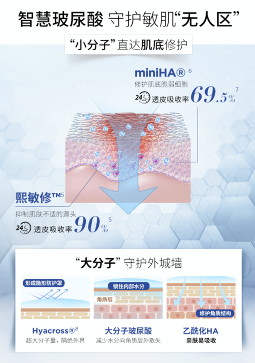 同时,润百颜本身也在不断地提升产品的科技价值。润百颜通过无数实验证明,HA除了补水,还具有显著的修护的功效,新品次抛中的专利成分miniHA通过酶切法使分子量小于10KDa,熙敏修™通过酶切法使分子量小于5KDa,其中,miniHA可以直达真皮修护肌底24小时透皮吸收69.5%,而熙敏修™24小时透皮吸收率高达90%,能修护受损细胞,有效降低敏感因子活性,修护脆弱。
