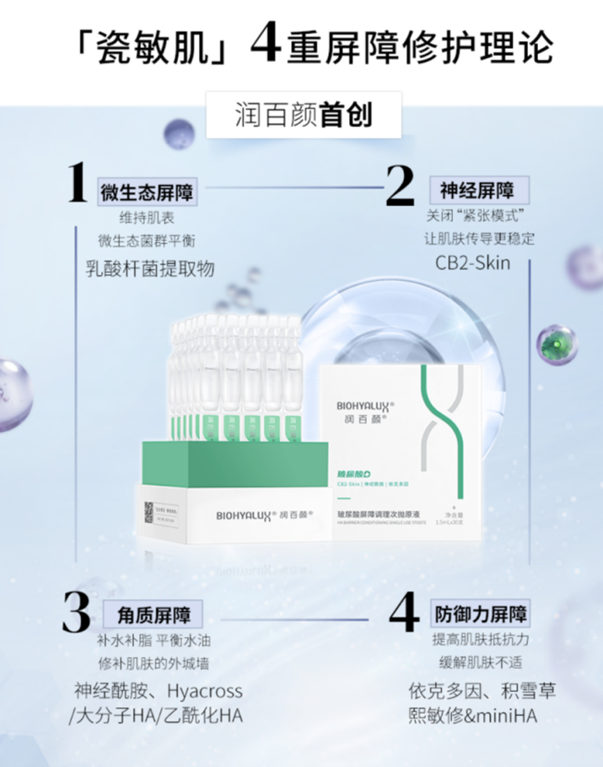 瓷敏肌是指肌肤内在不强韧,外在不抗造,正处于一种瓷器般脆弱的亚健康状态之中。对于瓷敏肌的修复还属市场空白,而润百颜新品“玻尿酸屏障调理次抛”率先进驻敏肌修护“无人区”,全面呵护“瓷敏肌”;首先提出“神经(传导)屏障修护”,配合智慧玻尿酸舒缓修护肌肤不适,长期使用调理维稳,增强神经耐受力。这次的新品,可以说是润百颜进军护肤新领域,开辟敏感肌护肤蓝海的一次尝试。