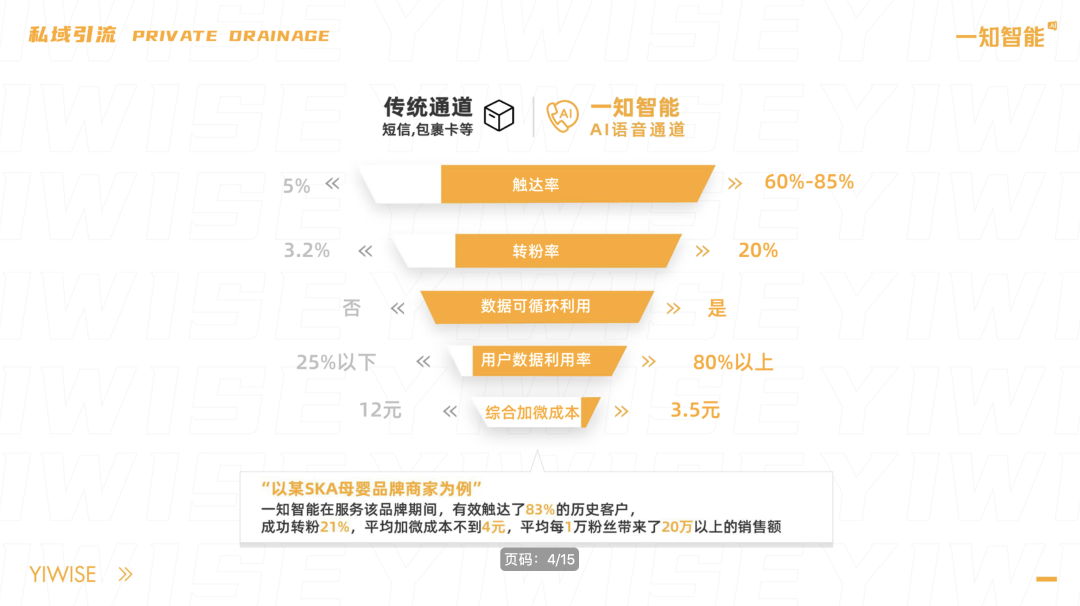 一知智能就是在这个时候被发现的。这家2017年孵化于浙大人工智能实验室的“直男”AI公司,成立前3年都在搭建基于NLP(语义理解)的机器人语音大脑,直到2020年私域兴起,那些为流量成本焦急的新锐消费品公司主动找上门,希望能基于一知的AI语音交互产品提升私域构建效率,于是有了文章开头,M小姐接到的品牌方“私域导流”AI语音电话。