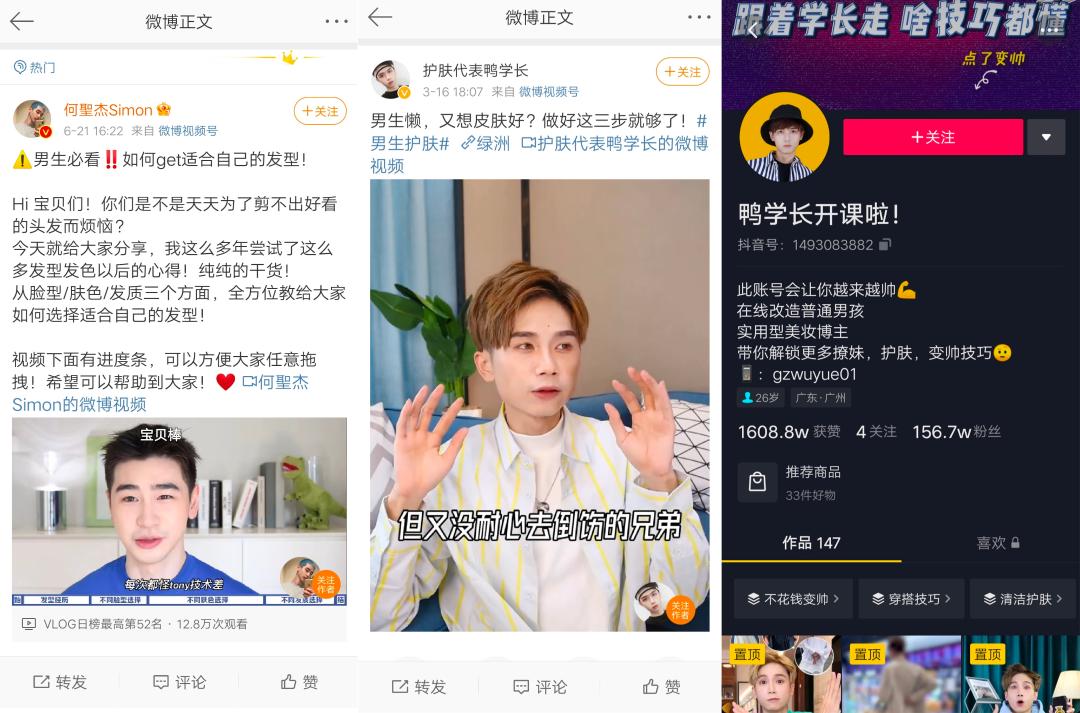 如男性护肤KOL芥末Jim的粉丝男女性别相对均衡、微博VLOG博主何聖杰Simon(微博粉丝72.6万)的粉丝男女比例8:2,鸭学长开课啦(在线改造普通男孩)抖音号的更新;李佳琦的口头禅之一,也从“所有女生,变成了所有女生男生”......这些无一不证明了男性消费者在男性美妆KOL群体的“活跃”。