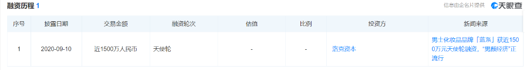 再加上男性自我颜值管理和消费意识的崛起这一机遇,理然被资本看中了。与此同时,蓝海市场的出现及男性消费者的动向让资本也开始向男士个护领域扎堆,除了理然、亲爱男友外,国货男士化妆品品牌蓝系也是其中的一个案例,据天眼查消息显示,成立于2019年3月,旗下拥有男士护肤线和男士彩妆两条产品线,在2020年9月其获得了1500万元天使融资。