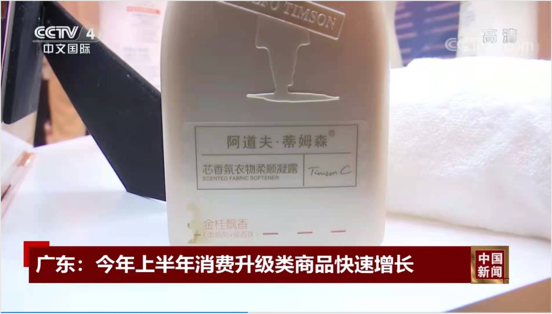 据《中国新闻》报道,广东今年上半年消费升级类商品快速增长,其中日用品类商品零售额同比增长16%。与新闻内容相对应的视频画面中,出现了阿道夫洗发水和蒂姆森芯香氛洗衣凝露的身影。