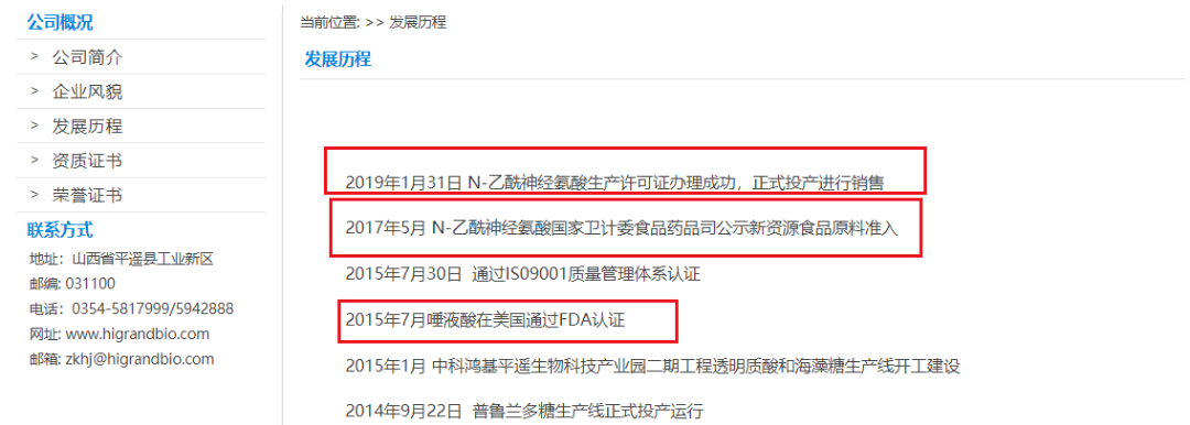 据中科鸿基官网显示,企业成立于2010年,主要业务涉及生物科技产品的研发、生产和销售,其与中科院微生物研究所为战略合作伙伴。发展历程中显示,2015年7月唾液酸在美国通过FDA认证;2017年5月N-乙酰神经氨酸国家卫计委食品药品司公示新资源食品原料准入;2019年1月31日N-乙酰神经氨酸生产许可证办理成功,正式投产进行销售。