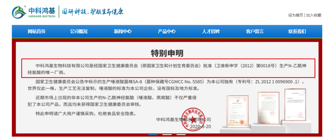 且值得关注的是,中科鸿基官网首页有则特别声明:中科鸿基是经国家卫生健康委员会(原国家卫生和计划生育委员会)批准(卫食新申字(2012)第0018号)生产N-乙酰神经氨酸的唯一厂商;国家卫生健康委员会公告中标示的生产唾液酸菌株SA-8为中科鸿基独有专利,世界仅此一株,生产工艺无法复制,唾液酸的标准为中科鸿基企标,没有国标及地方标准。