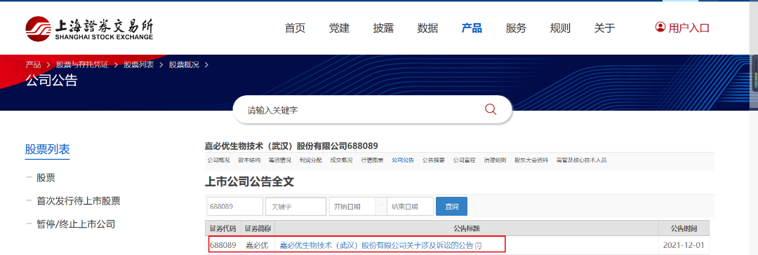 据嘉必优在上海证券交易所在2021年12月1日披露的关于涉及诉讼的公告显示,嘉必优近日收到广东省高级人民法院送达的案号为(2021)粤知民初3号的起诉材料及证据等相关文件。中科鸿基生物科技有限公司(下称“中科鸿基”)因商业秘密纠纷对嘉必优、武汉中科光谷绿色生物技术有限公司(为嘉必优子公司,下称“中科光谷”)及汤臣倍健股份有限公司(下称“汤臣倍健”)提起诉讼。