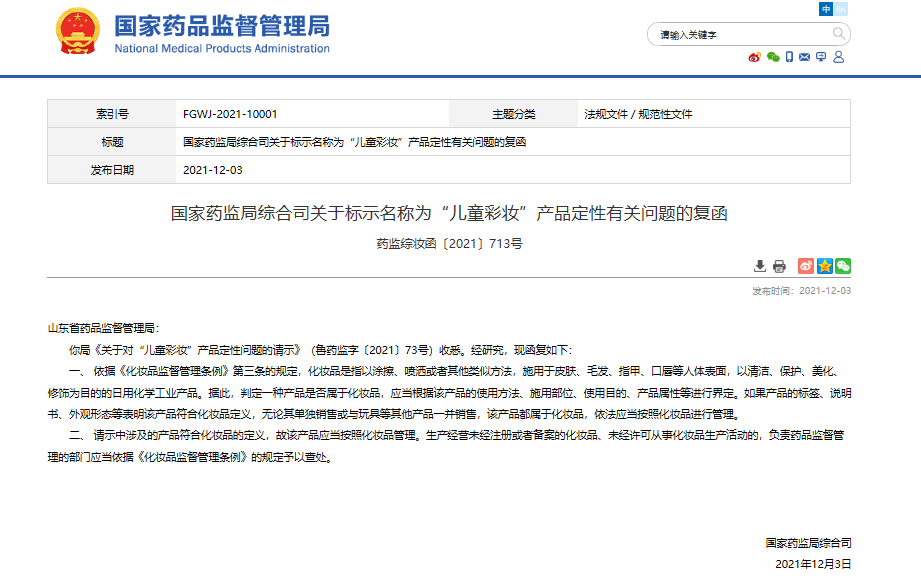 昨日(12月3日),国家药监局综合司发布了关于标示名称为“儿童彩妆”产品定性有关问题的复函(药监综妆函〔2021〕713号)(以下简称复函) 。从复函的受文单位来看,该回复针对的是山东省药品监督管理局发出的《关于对“儿童彩妆”产品定性问题的请示》。