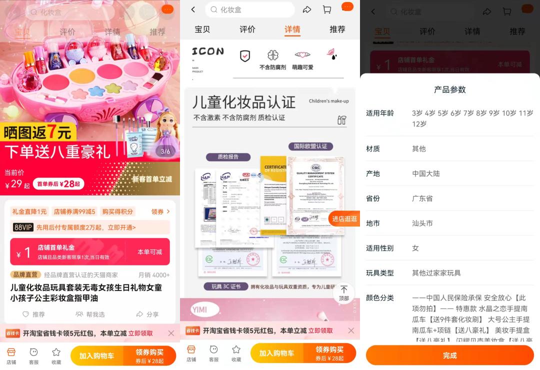 记者还发现,该商家在产品的详情页还展示了质检报告、国际欧盟认证以及玩具3C证书,并强调其拥有化妆品与玩具双重资质,专为儿童研制。显然,商家承认该产品为化妆品,但是在其详情页却没有相关的产品注册备案信息。