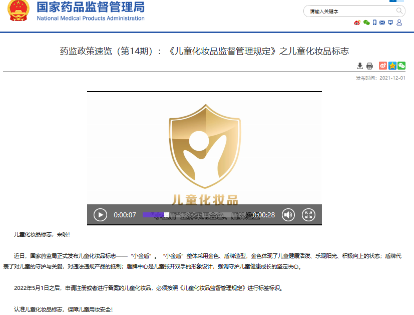 12月1日,国家药监局网站发布公告,公布儿童化妆品标志“小金盾”,用于标注在儿童化妆品销售包装展示面。