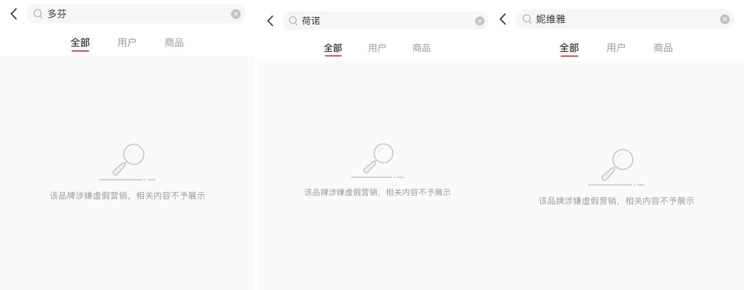 以上述品牌为关键词在小红书上搜索,相关笔记已无法显示,搜索出的页面皆是:“该品牌涉嫌虚假营销,相关内容不予展示。”