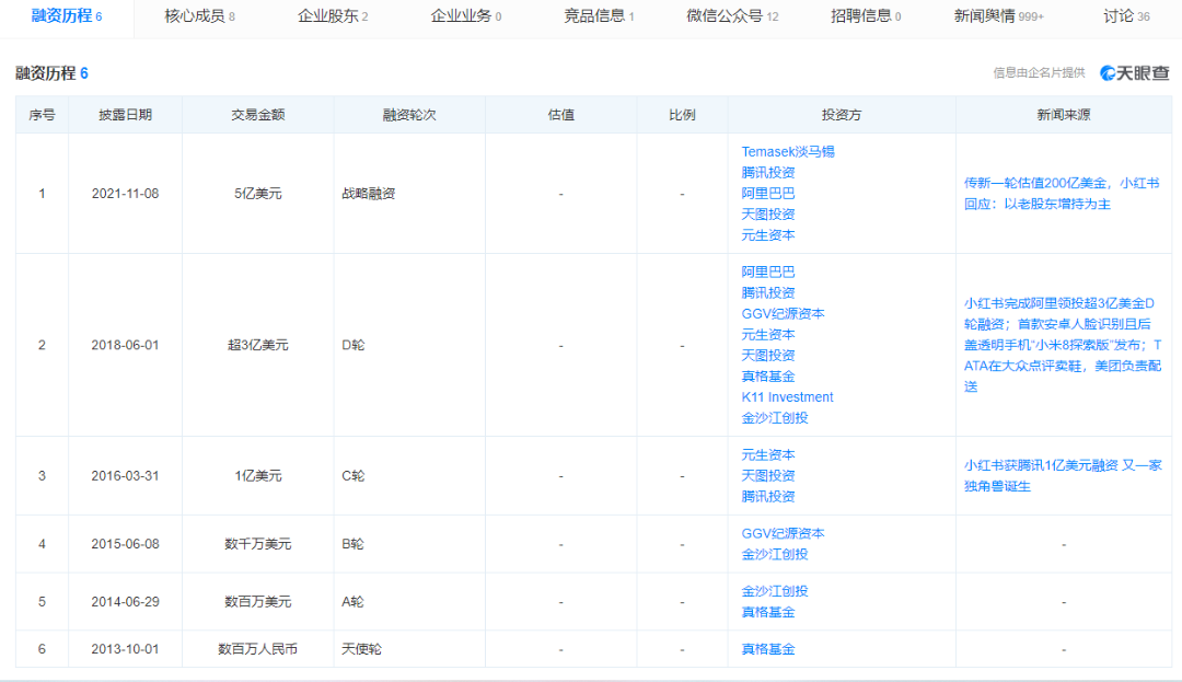 与此同时,成立于2013年的小红书截止目前已获得6轮融资,据天眼查消息显示,2021年11月8日,小红书新一轮5亿美元融资,由淡马锡和腾讯领投,阿里、天图投资、元生资本等老股东跟投,投后估值高达200亿美元。