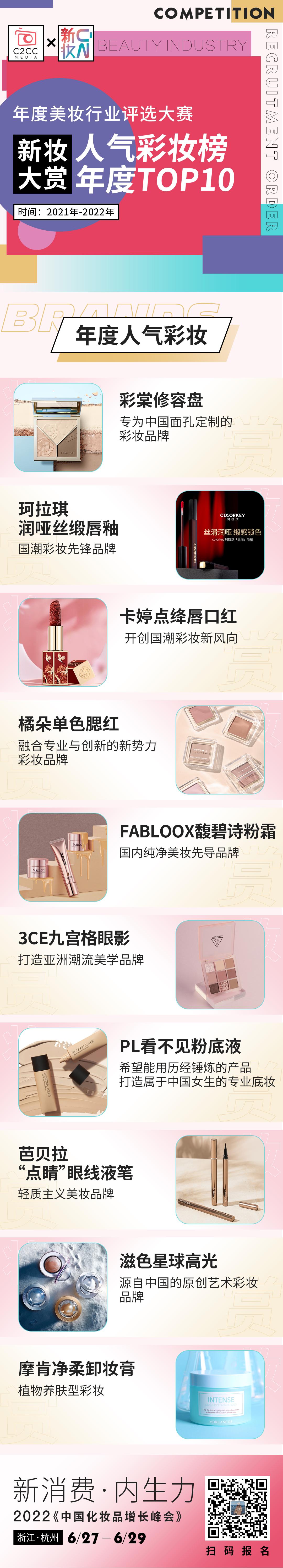 最后,此次新妆大赏的颁奖盛典,将于2022年6月27-29日C2CC传媒举办的主题为《新消费·内生力——2022中国化妆品增长峰会》上举办。除了此次公布的年度TOP人气美妆和新势力品牌榜单外,我们还会陆续评选出年度品牌、年度新品、零售新物种和优秀渠道商等其他多个权威奖项,后续相关奖项事宜请持续关注我们,更多精彩大家拭目以待!