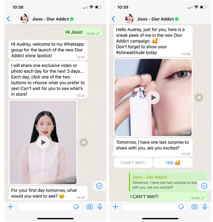 这个广告项目能让迪奥美妆在 Instagram的960万粉丝在四天时间内通过 WhatsApp 查看品牌独家内容并“对话” Jisoo。具体来说,粉丝首先通过 Instagram加入 Jisoo在 WhatsApp的独家粉丝群。然后粉丝将进入一个专属页面,注册后可通过 WhatsApp 与 Jisoo 的chatbot聊天机器人开始“私信”对话。对话内容可包括图片、视频、文件、网页链接、音频等多样形式。
