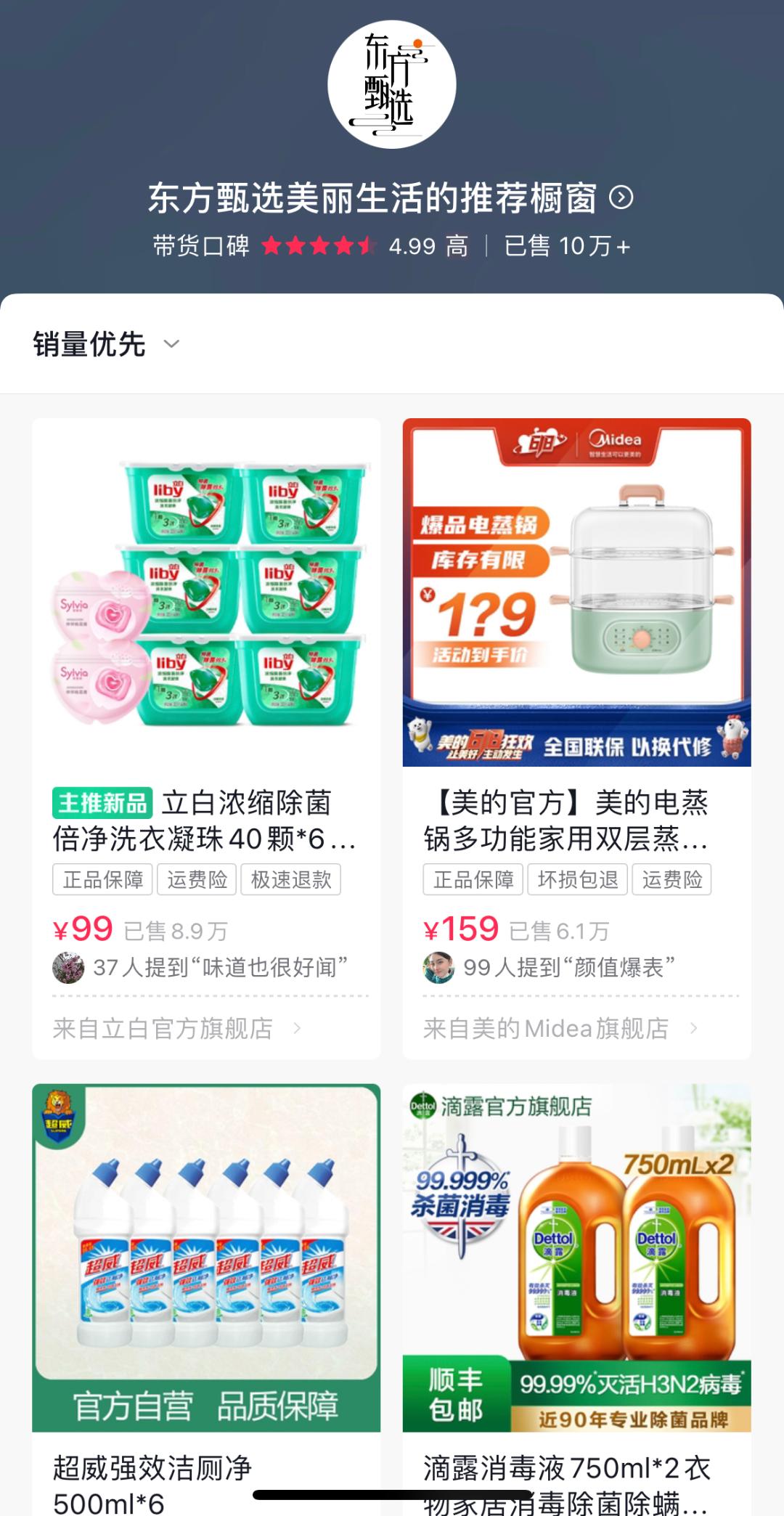 据C2CC传媒观察,其橱窗商品销量较高的为家清类产品,如洗衣凝珠、消毒液、洗洁精、浴巾等生活用品。在97件好物中,美妆产品仅有10件,占比较低。但相对于TVB识货(港式甄选),“东方甄选美丽生活”的商品渠道皆来自品牌官方旗舰店,尚未出现产品真假质疑现象。