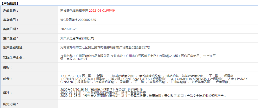 在国家普通化妆品服务平台、国家非特殊用途化妆品备案服务平台中查询到郑州辰之贸商贸有限公司仅有一款南袖睫毛滋养精华液备案信息,于今年4月1日已经注销。