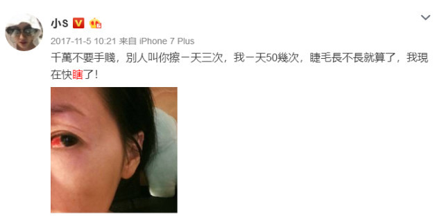 2017年,她使用睫毛生长液时,一天使用了50多次,之后在微博上晒出了眼眶充血的图片,称自己险些致盲。