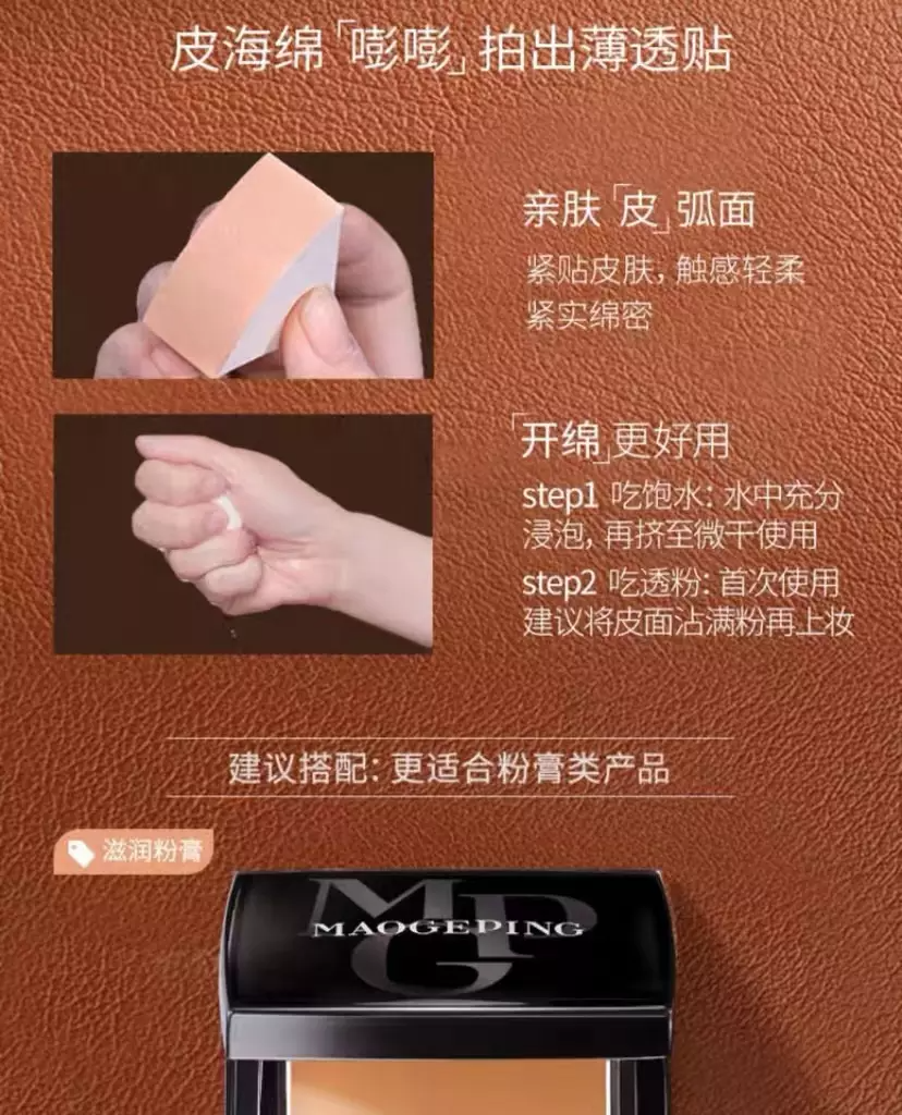 视线收回至本土品牌,毛戈平的三角皮面海绵可谓名头响亮。一小块卖二三十,搭配毛戈平粉膏使用。重点不在于粉膏、不在于皮面,而是上妆手法。