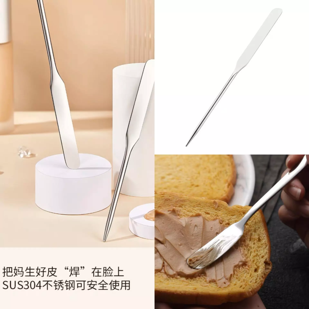 近期流行的粉底铲分三种类型。一种是80块一支的正版Piccasso(毕加索)化妆铲,一种是义乌加快步伐赶制出的个位数山寨品,还有一种则是替代品——黄油刀、勺子柄。