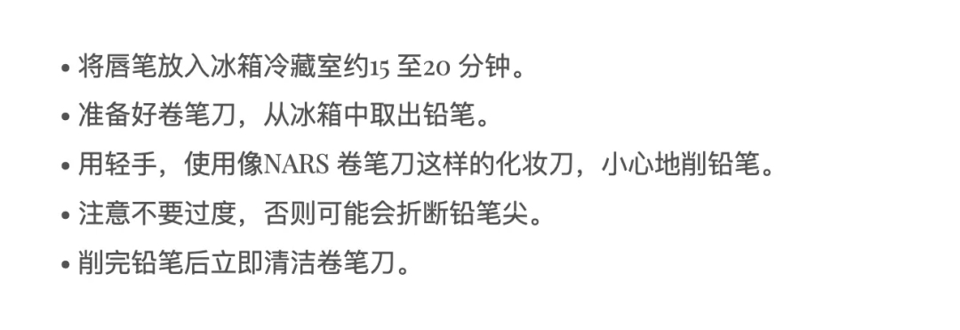 我刚学习化妆时,跟风买过Nars的豆沙色蜡笔口红,第一次削时怎么也找不到适合粗细卡口的卷笔刀,只好用裁纸刀一点一点尝试削,看着膏体伴随纸屑一起落下,有种自己被抢了钱的难过感。