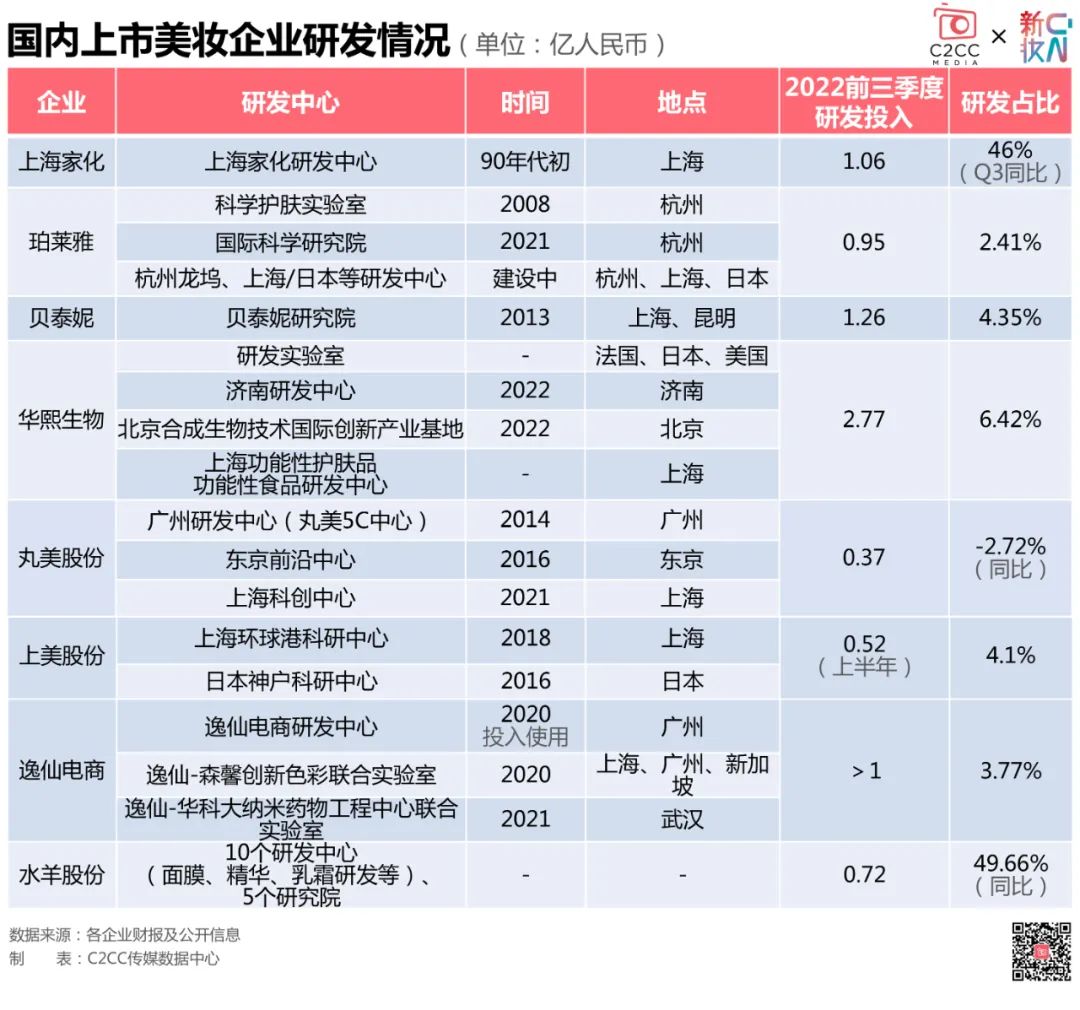 据C2CC传媒X新妆不完全统计,上海家化、贝泰妮、华熙生物、珀莱雅、丸美股份、上美股份、逸仙电商等国内美妆上市企业,都在研发上强势布局。在非上市公司中,如伽蓝集团、欧诗漫、百雀羚、花西子母公司宜格集团、环亚集团等头部国货企业,也都自建研发中心与研发平台,或依托科研院所设立合作实验室,搭建企业独特的研发体系。