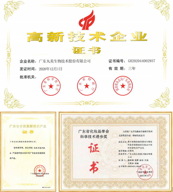 丸美已获广东省生物护肤品工程技术研究中心、广东省企业技术中心、广州市黄埔区博士后创新中心认定,并组织联合多家行业知名企业、原料企业、高校、科研机构、协会学会等成立了粤港澳大湾区衰老与再生医学产学研创新联盟,集合行业力量,在为公司研发赋能,推动行业细分领域的有序、平衡发展。丸美于2019年通过知识产权管理体系认证,具有完善的知识产权布局与管理能力。