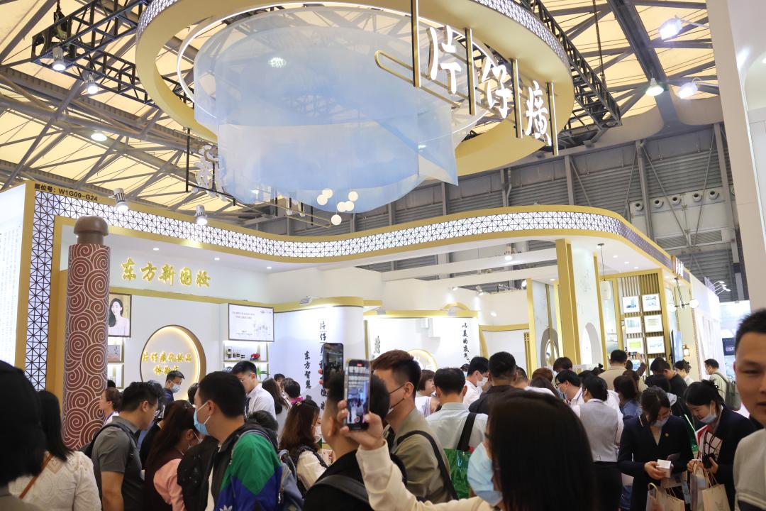 贴合全新主题的发布,片仔癀化妆品再次将国风元素带入展馆设计中。整体采用古今结合的新中式风格,融合片仔癀化妆品体验店的设计元素,在产品展示区、商务洽谈区、贵宾接待区周边均布有古典陈设。