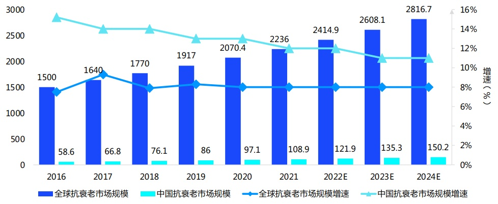 据Zion Market Research的研究数据,2021年全球抗衰老市场规模达到2236亿美元,年复合增长率约7.8%。另据Euromonitor数据显示,2021年中国抗衰市场规模达109亿美元(约合722亿元人民币),同比增长12.15%,增速明显高于全球市场,且增速连续3年上升。