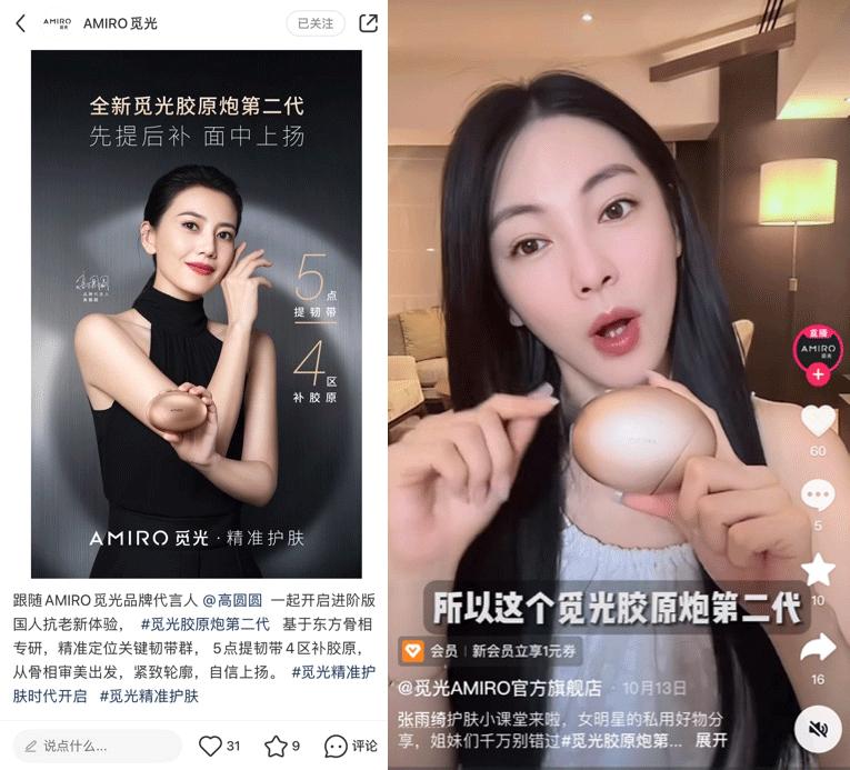 AMIRO觅光,成立于2015年底的科技美容品牌,擅长通过尖端技术简化护肤步骤,并以“光电美容专家”的品牌定位著称。蔡少芬、蔡卓妍、钟欣潼、张雨绮等一批知名女星都曾AMIRO觅光其种草。在抖音、小红书等平台,你都能找到一大批AMIRO觅光的忠实爱好者。
