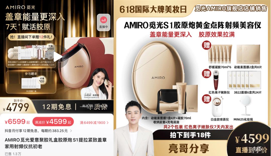 以线上渠道为例,初代AMIRO觅光胶原炮在京东、天猫、抖音等电商平台官方旗舰店的预计到手价均为4599元。在抖音官方直播间及与官方直播间、贾乃亮、向太、琦儿等多位达人直播间,预估到手价也是这个数字。