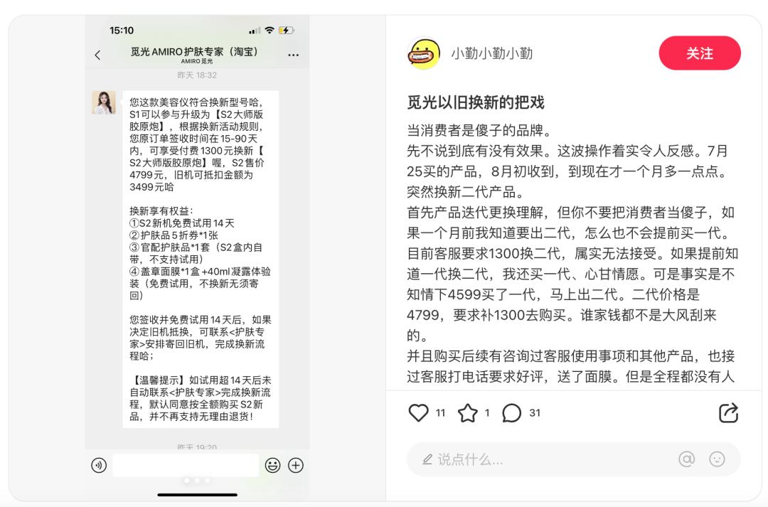 一位消费者透露,自己在去年7月线上下单了初代AMIRO觅光胶原炮花了4599元,8月初商品到货。但仅仅过了一个多月,品牌就发布了AMIRO觅光胶原炮二代。客服给的反馈是,可以补交1300元更换为二代产品。这位消费者评价道:“二代的价格是4799,谁家钱都不是大风刮来的。”