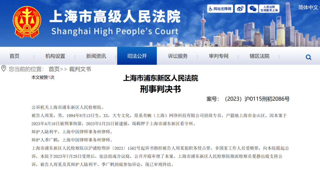 近日,上海市高级人民法院公布了一份刑事判决书,涉及美腕(上海)网络科技有限公司(以下简称美ONE)一名招商专员利用职务之便,收受商家百万余元的好处费被判刑。