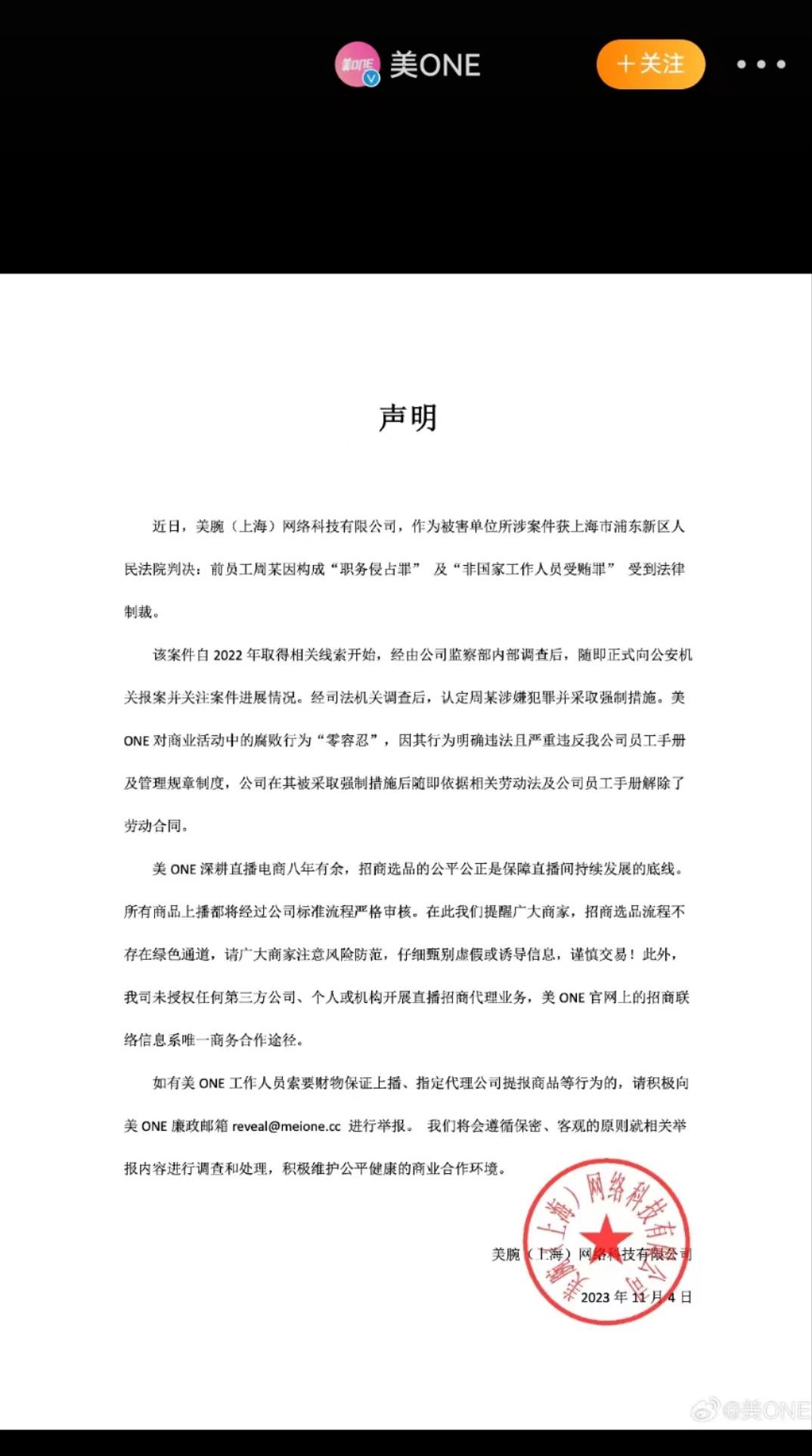 事件曝光后,11月4日深夜,美ONE在官方微博发表了声明。声明称,该案是2022年获得相关线索后,先进行了公司内部调查后,再向公安机关报案的。美ONE表示,公司对商业活动中的腐败行为“零容忍”。涉事员工行为明确违法且严重违反公司员工手册及管理规章制度,公司在其被采取强制措施后随即解除了劳动合同。美ONE在声明中还提到,招商选品流程不存在绿色通道,未授权任何第三方公司、个人或机构开展直播招商代理业务。