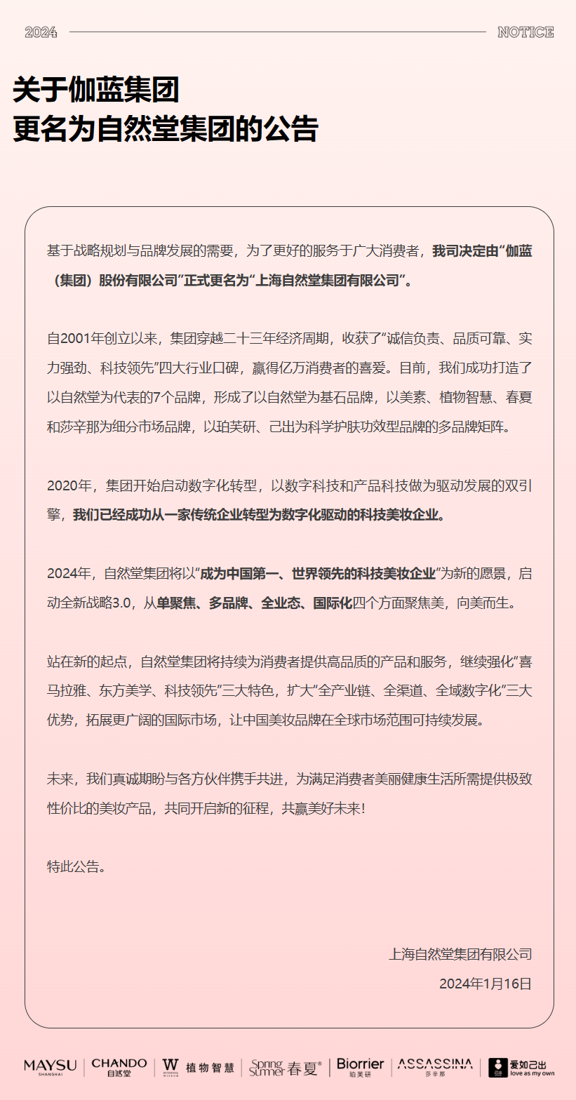 1月16日,伽蓝集团在其公众号上发布更名为自然堂集团的公告。