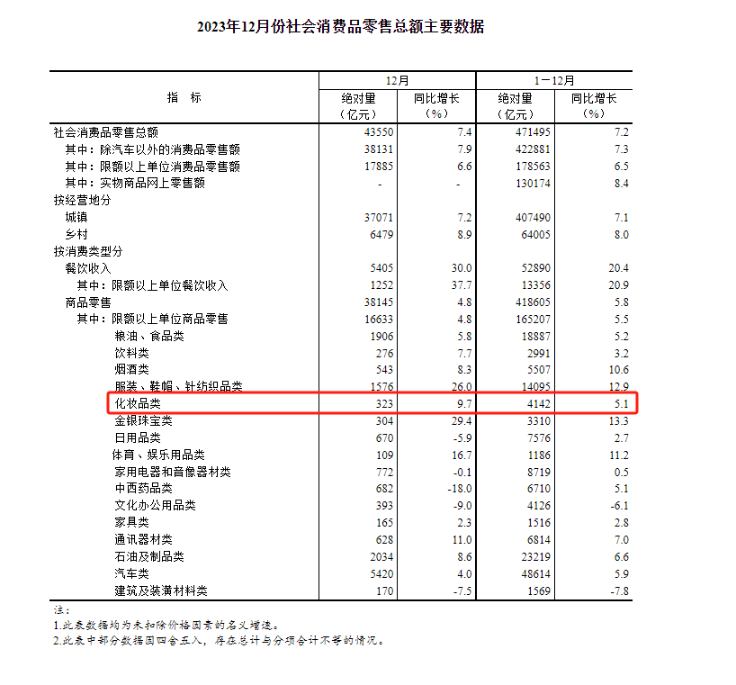 数据显示,2023年全年,国内社会消费品零售总额471495亿元人民币,同比增长7.2%,其中化妆品类零售总额为4142亿元人民币,同比增长5.1%。2023年12月份,社会消费品零售总额43550亿元人民币,同比增长7.4%,其中化妆品类零售总额为323亿元人民币,同比增长9.7%。