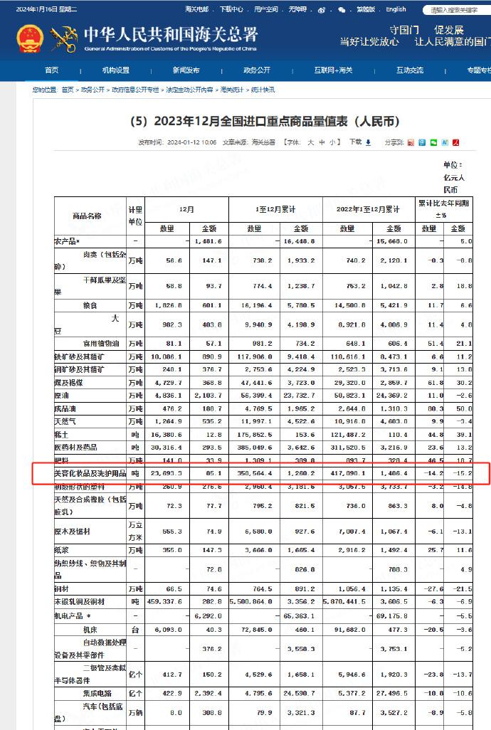 其中化妆品类的数量和金额数据呈现双下滑的趋势。数据显示,12月美容化妆品及洗护用品进口23693.3吨,同比下滑19.2%,进口总值为85.1亿人民币,同比下滑20.6%;1-12月美容化妆品及洗护用品进口358564.4吨,同比下滑14.2%,进口总值为1260.2亿元人民币,同比下滑15.2%。