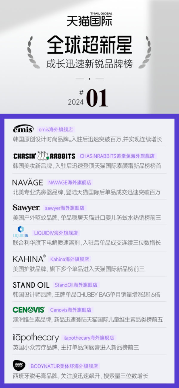 近日,天猫国际发布“2024一季度进口新品牌成绩单”显示,2024年第一季度,在天猫国际平台,新品牌成交总额增长179%,新品牌数量增长92%。