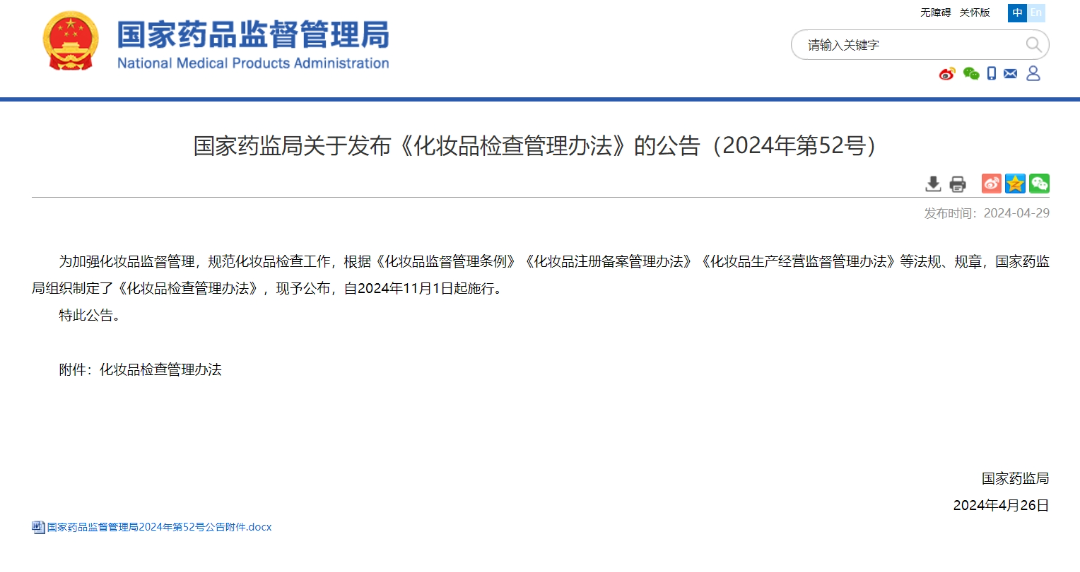 4月29日,国家药监局在官网发布关于《化妆品检查管理办法》(简称:《管理办法》)的公告(2024年第52号),宣布为加强化妆品监督管理,规范化妆品检查工作,根据《化妆品监督管理条例》《化妆品注册备案管理办法》《化妆品生产经营监督管理办法》等法规、规章,国家药监局组织制定了《管理办法》,于2024年11月1日起施行。