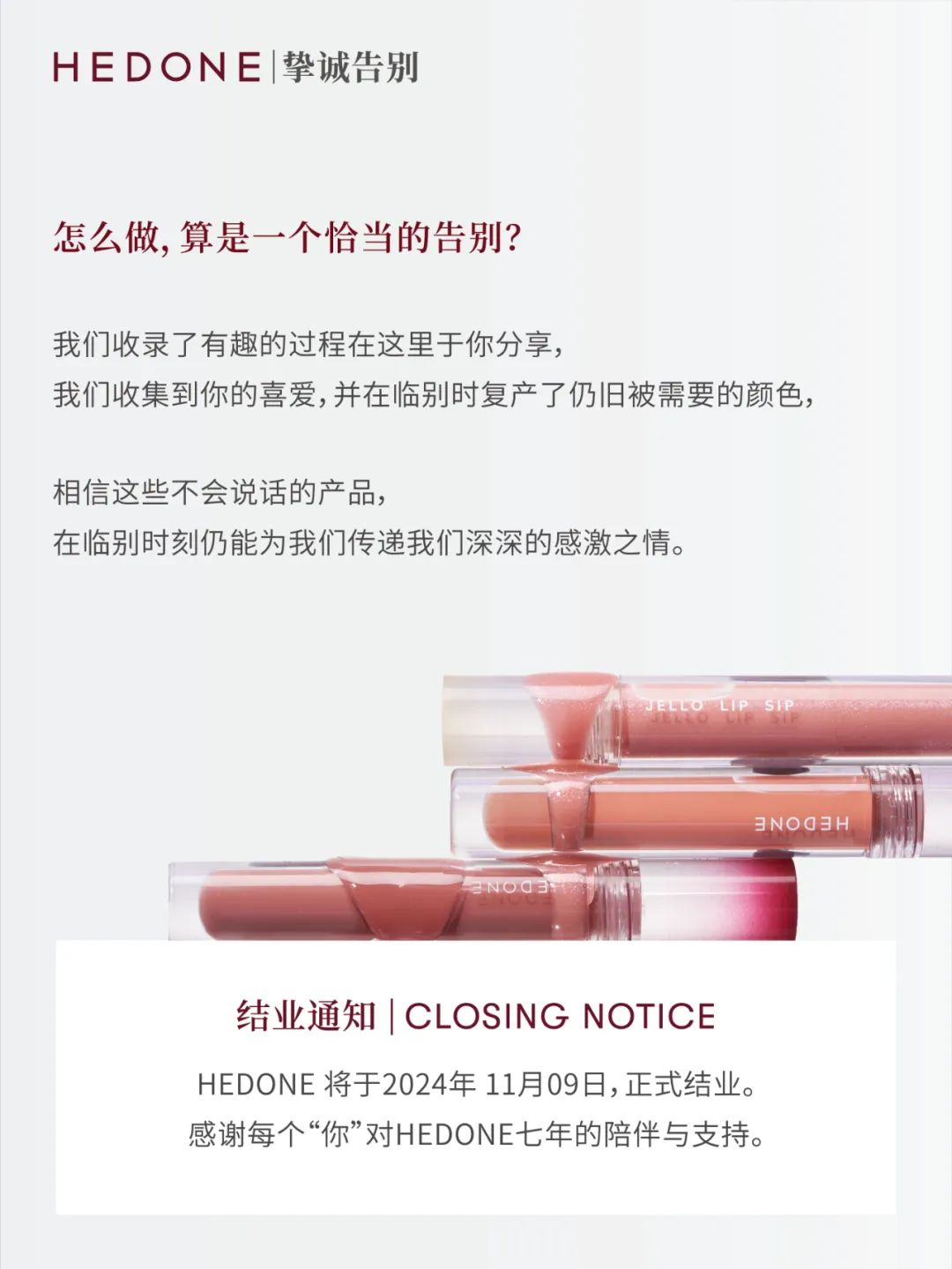 10月10日,本土新锐彩妆品牌HEDONE在其官微发布了一封“告别书”,正式宣布品牌将于2024年11月9日停止运营。这也意味着这个成立仅6年,月销曾破千万的新锐彩妆品牌最终还是画上了终止符号。