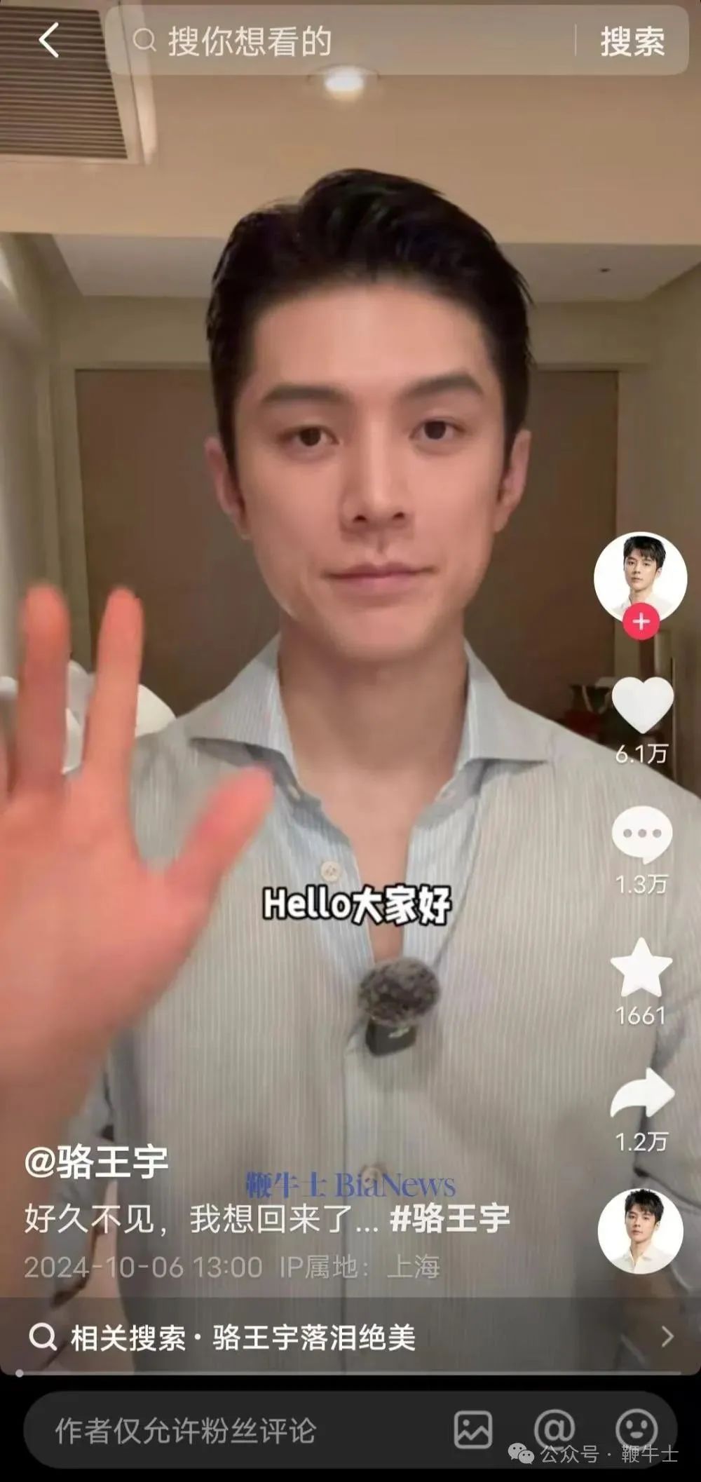 10月8日,“退网”近三个月的千万粉丝大网红、抖音美妆一哥骆王宇在其抖音账号上发布视频《好久不见,我想回来了……》,正式官宣回归,并宣布双十一的直播带货在10月14日开始。